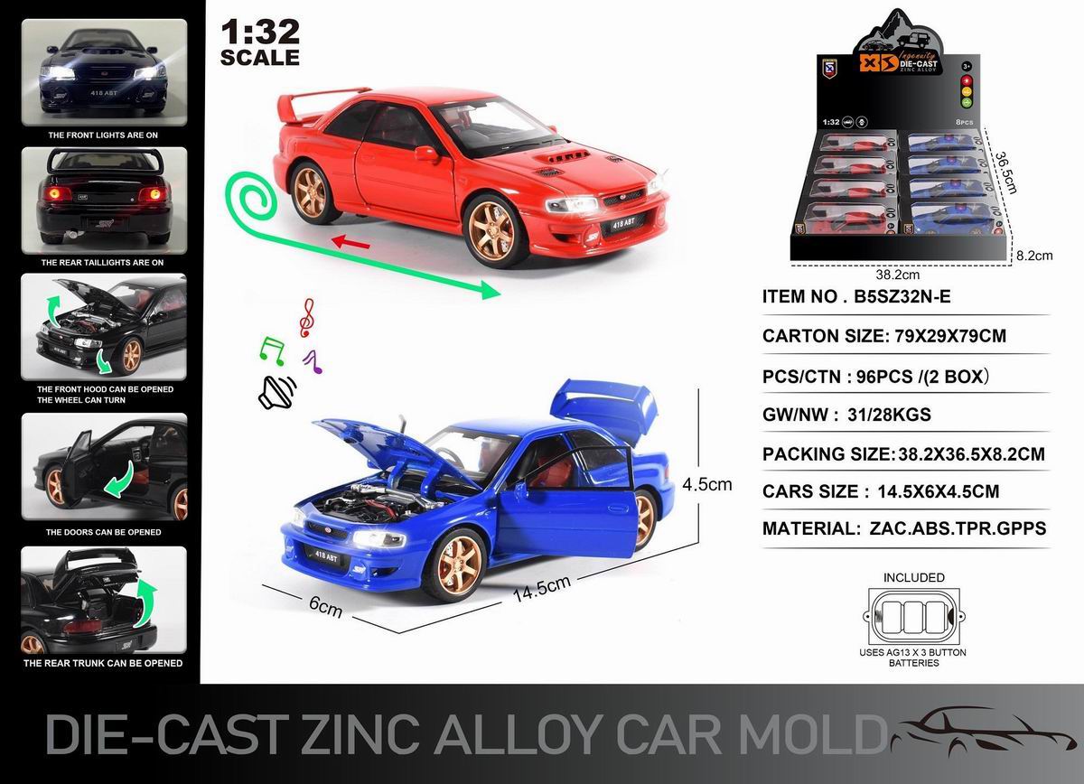 英文1:32压铸锌合金灯光音效斯巴鲁翼豹车模 8只/展示盒 |