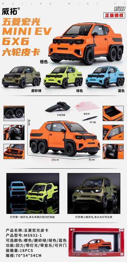 1:18正版授权五菱mini皮卡(回力,带灯光带音乐,可开门)橙/蓝/绿/荧光绿每个颜色装一件,清装! |