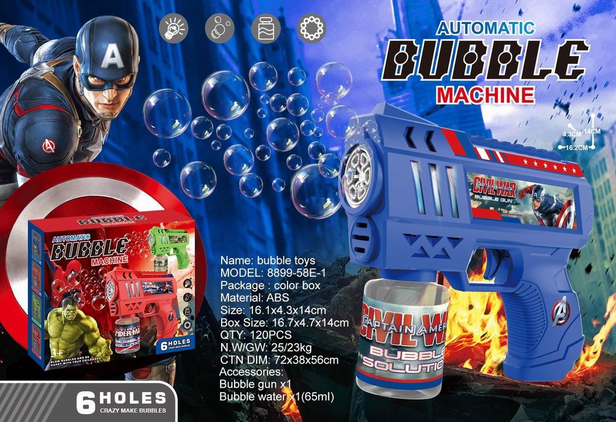6孔美国队长太空泡泡枪2色 (配1瓶65ML泡水)带灯光使用4颗5号电池不包 |