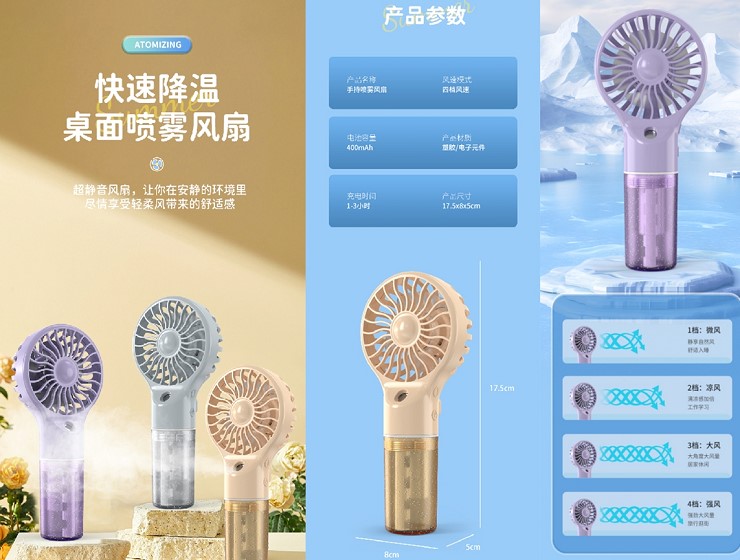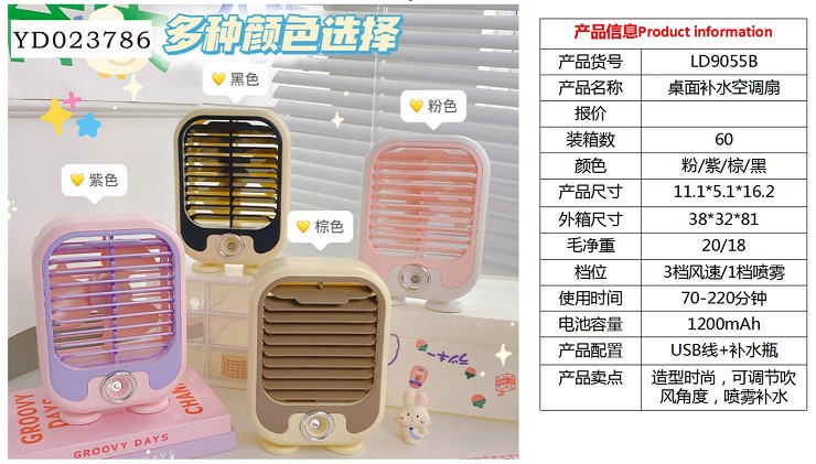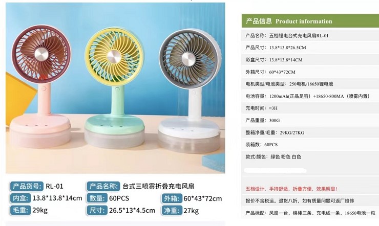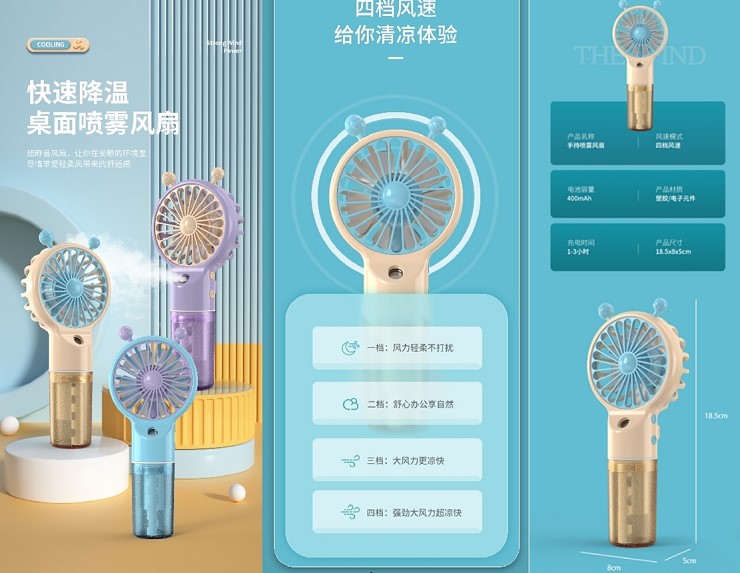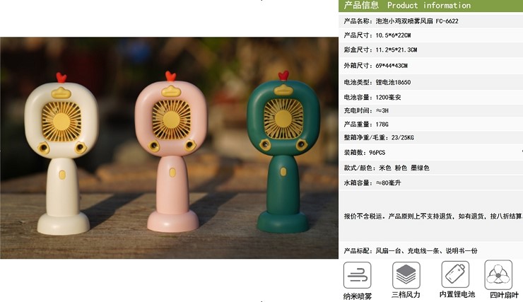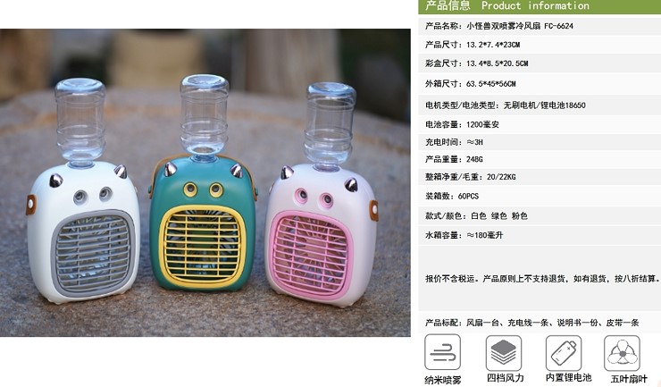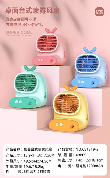 小鹿桌面台式喷雾充电风扇1200毫安三档