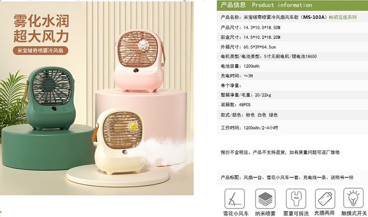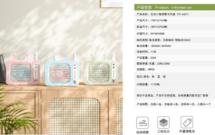 无忧小兔喷雾冷风扇(无刷电机/锂电池18650,1200mAh) |