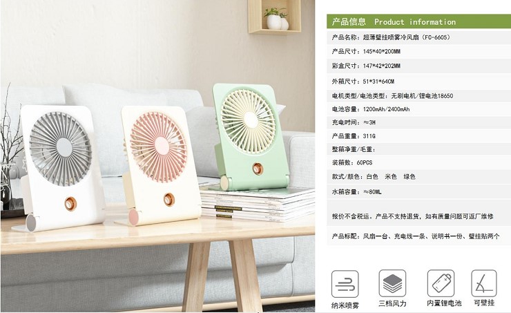 超薄壁挂喷雾冷风扇(无刷电机/锂电池18650,1200mAh) |