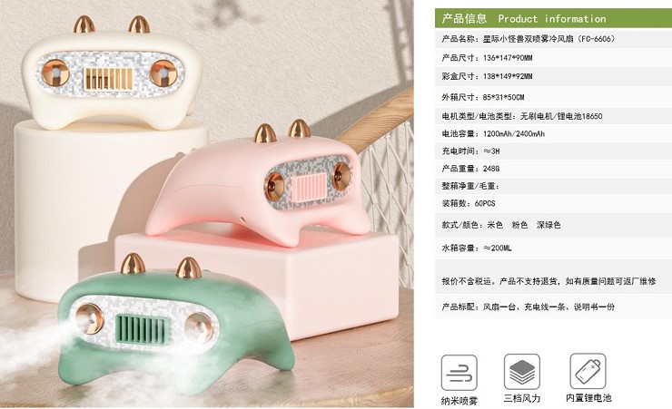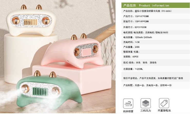 星际小怪兽双喷雾冷风扇(无刷电机/锂电池18650,2400mAh) |