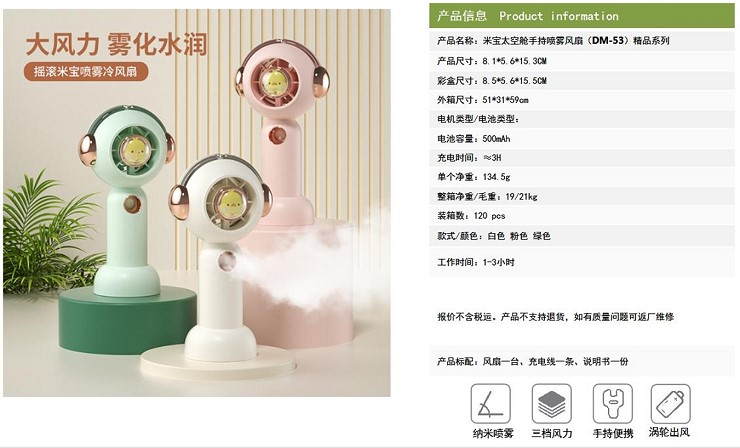米宝太空舱手持喷雾风扇500毫安三档 |