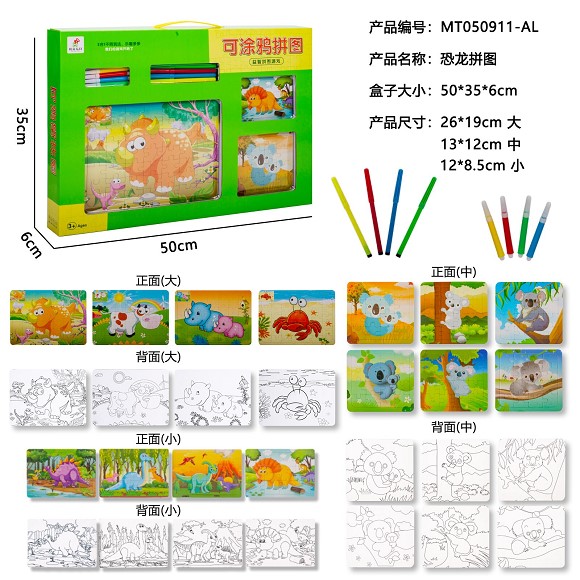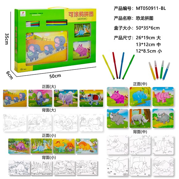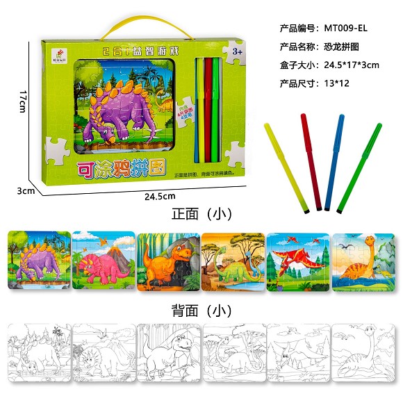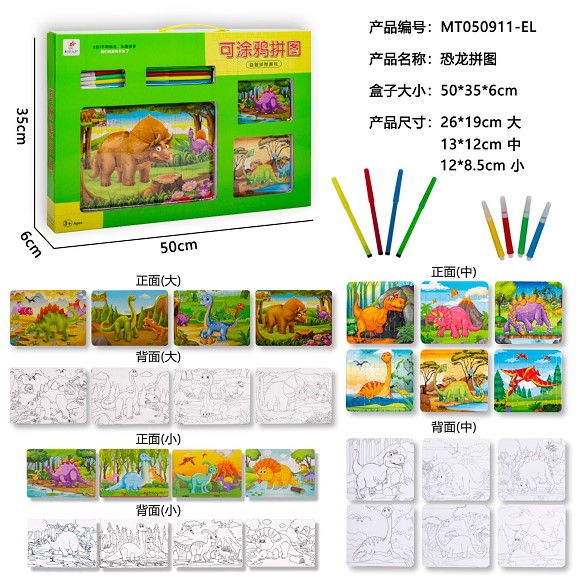 可涂鸦恐龙拼图(6拼图+4色笔)