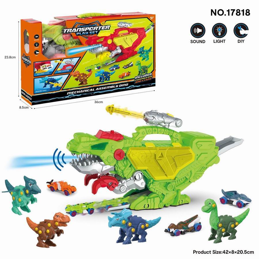 声光恐龙收纳轨道车(绿色 配4个车子和4只拆装恐龙,发射炮)