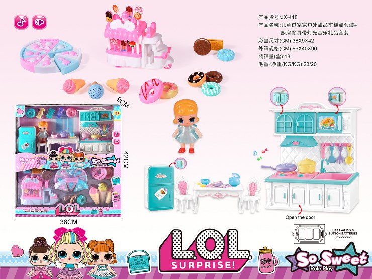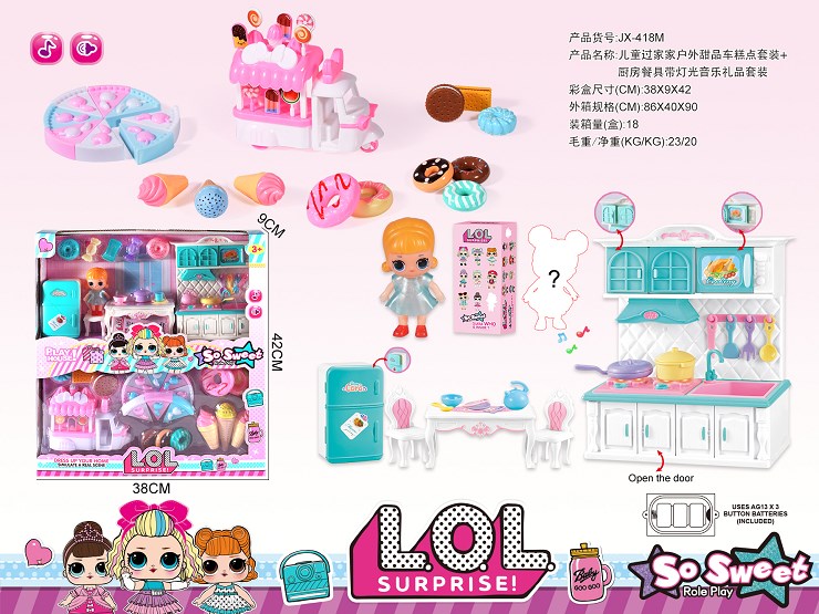 惊喜娃娃厨房餐具+户外雪糕车双层过家家套装(带盲盒)