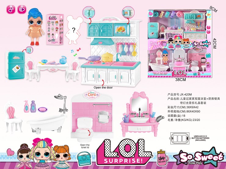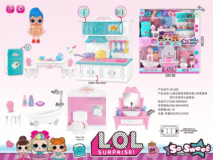 惊喜娃娃厨房餐具+浴室双层过家家套装