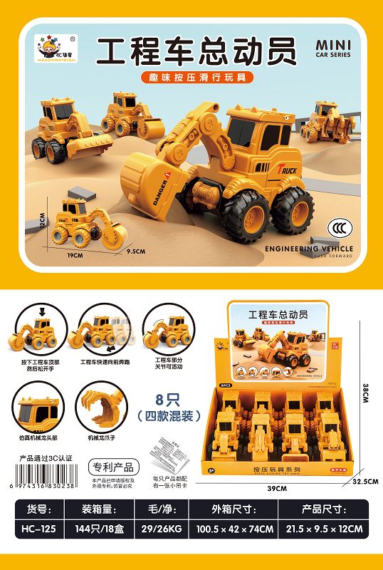 按压工程车总动员(四款混装)(按压功能,搭配4款车头推土、压路、挖机、抓料、车身带微恐龙元素 背脊、爪子、挖臂、眼睛部位体现)